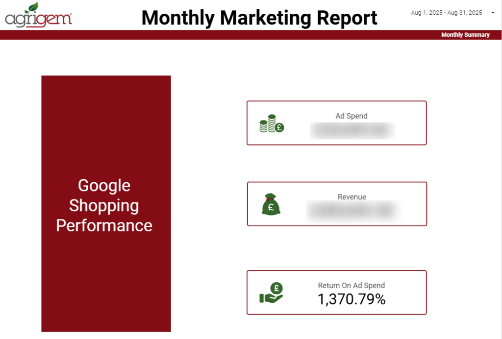 We have been working with Agrigem ever since and have introduced Microsoft Bings Advertising, done a technical SEO audit that was then used as guidance to build the current new website and built a custom Google looker studio dashboard that shows a top level overview of their marketing channels, as well as product category level return on ad spend.