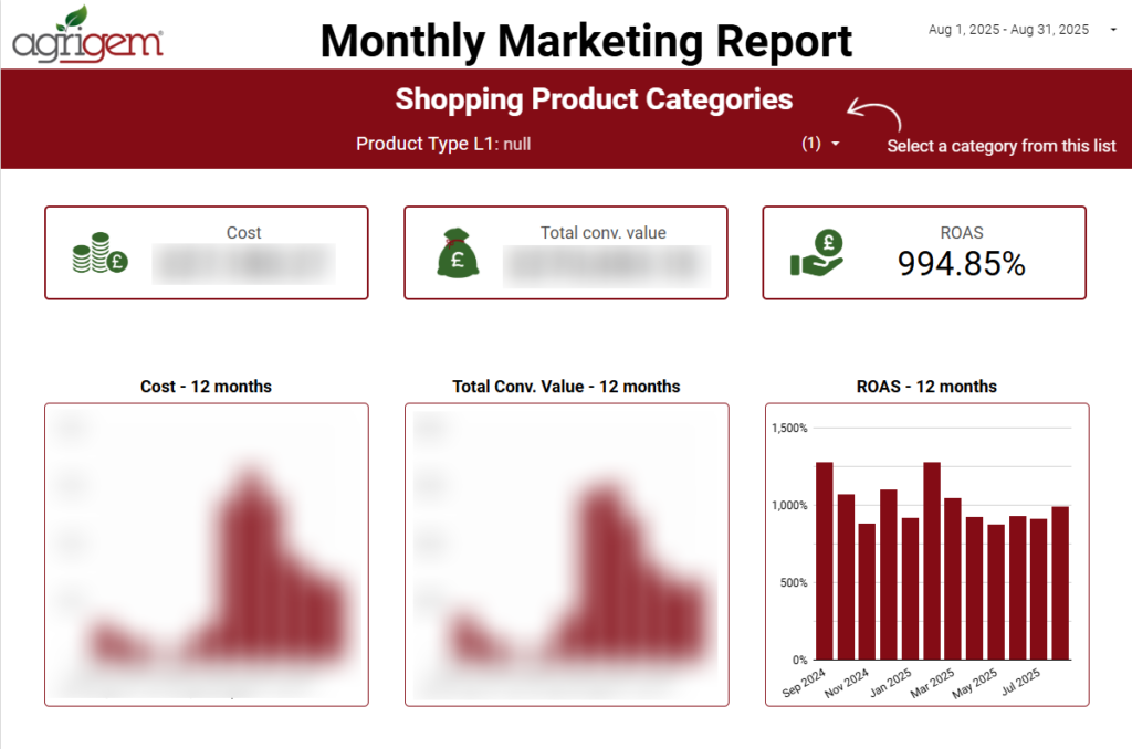 The Google Looker Studio Dashboard also allows them to filter to specific product categories (which often have different ROAS targets) to see how these are performing both within the given month AND see a 12 month trend graph showing Cost, Conversion Values and Return on Ad Spend).